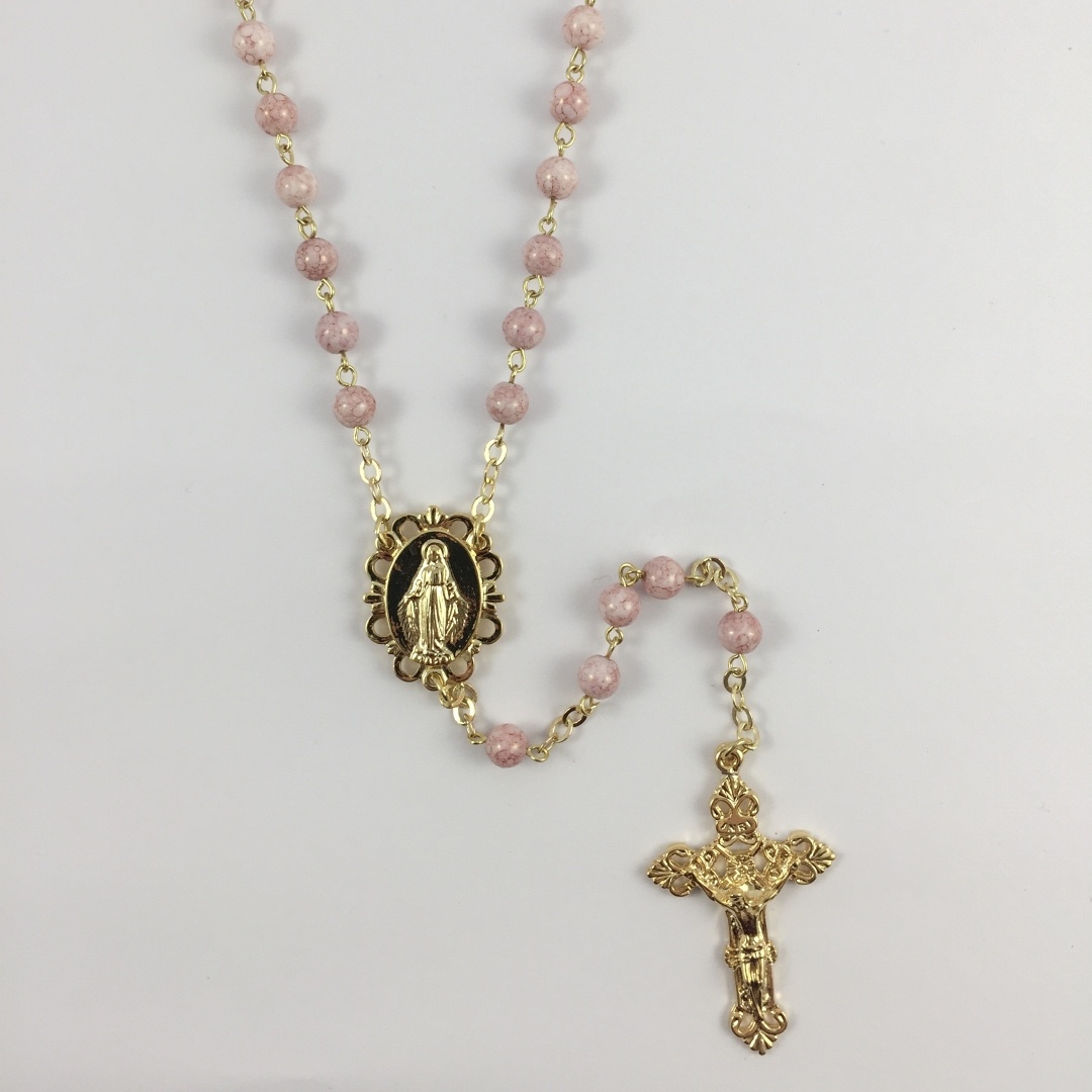 This rosary is made of pink blown glass beads with gold-coated Miraculous centrepiece and crucifix. They come in a red velour gift box.