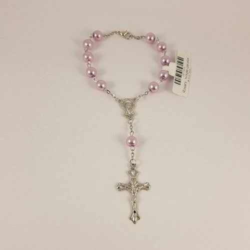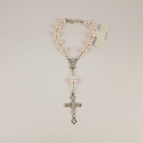 This one-decade rosary has a clip in the middle, perfect for attaching to your car's rear-vision mirror. The beads are imitation pearl and are available in a variety of colours.